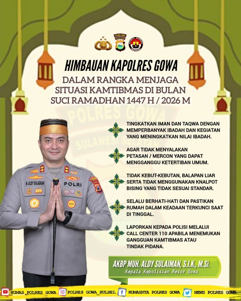 POLRES Gowa, Binkari – Dalam rangka menjaga situasi keamanan dan ketertiban masyarakat (kamtibmas) tetap kondusif selama Bulan Suci Ramadan 1447 H/2026 M, Kapolres Gowa Muhammad Aldy Sulaiman, S.I.K, M.Si menyampaikan imbauan kepada seluruh masyarakat Kabupaten Gowa, Kamis (19/2/202).