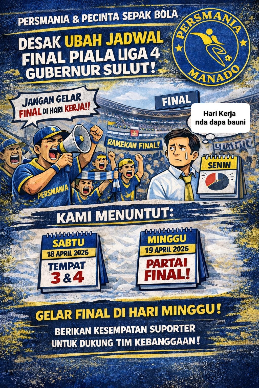Sulawesi Utara, Binkari — Gelombang kritik terhadap jadwal Final Liga 4 Piala Gubernur Sulut 2026 mulai menguat. Komunitas supporter PERSMANIA bersama pecinta sepak bola angkat suara, mendesak penyelenggara segera melakukan revisi jadwal yang dinilai tidak berpihak pada publik.