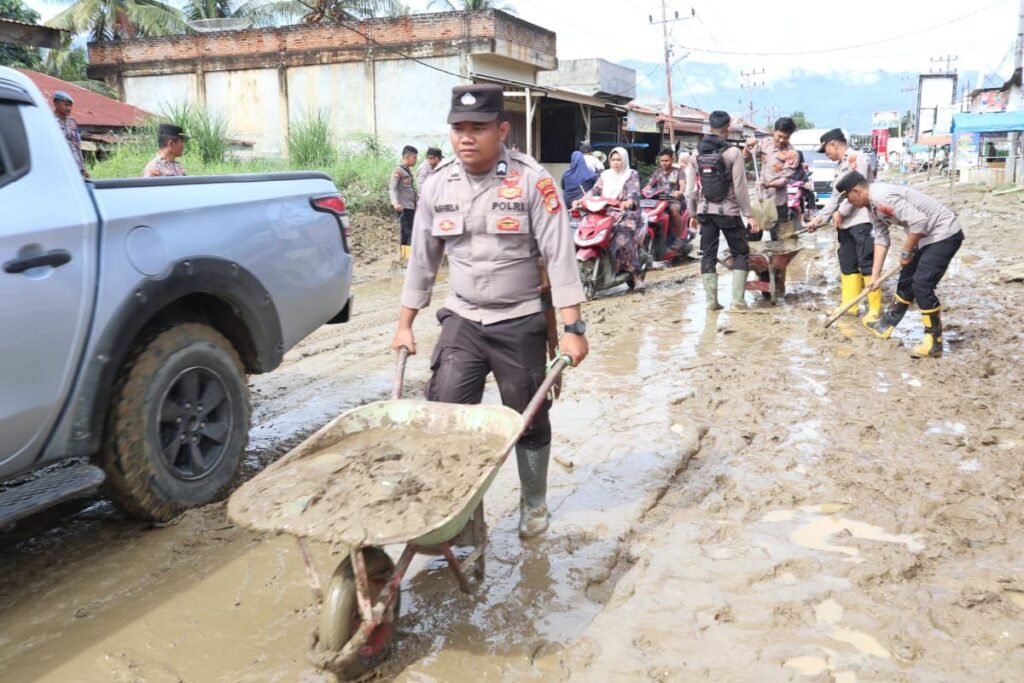 Gerak Cepat Polres Aceh Tenggara, Kapolres Aceh Tenggara Bersama Personel Kurve Bersihkan Lumpur Sisa Banjir di Bambel