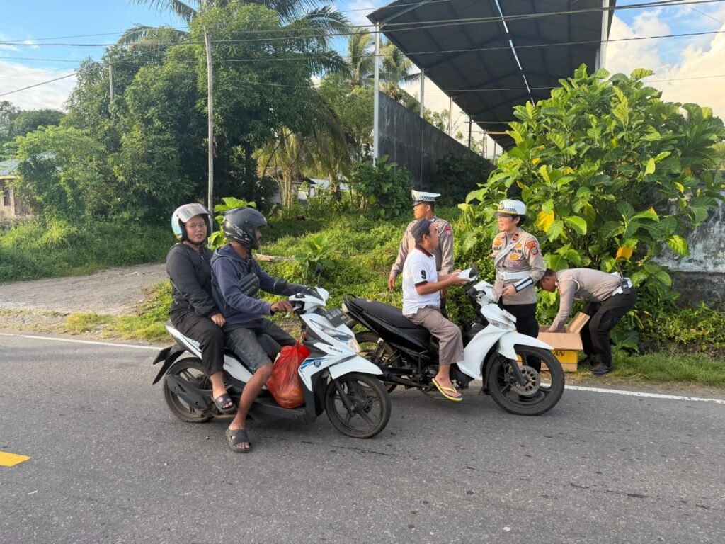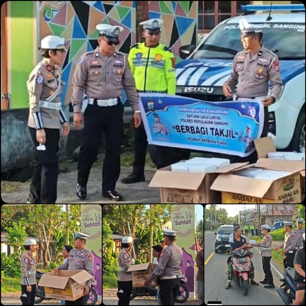 Tahuna, Binkari – Dalam rangka mengisi bulan yang penuh berkah dengan kegiatan positif, Kasat Lantas Polres Kepulauan Sangihe IPTU Nelta Rengkung menggelar aksi berbagi makanan takjil kepada masyarakat di wilayah Tahuna, Kabupaten Kepulauan Sangihe, Jumat (27/02/2026).