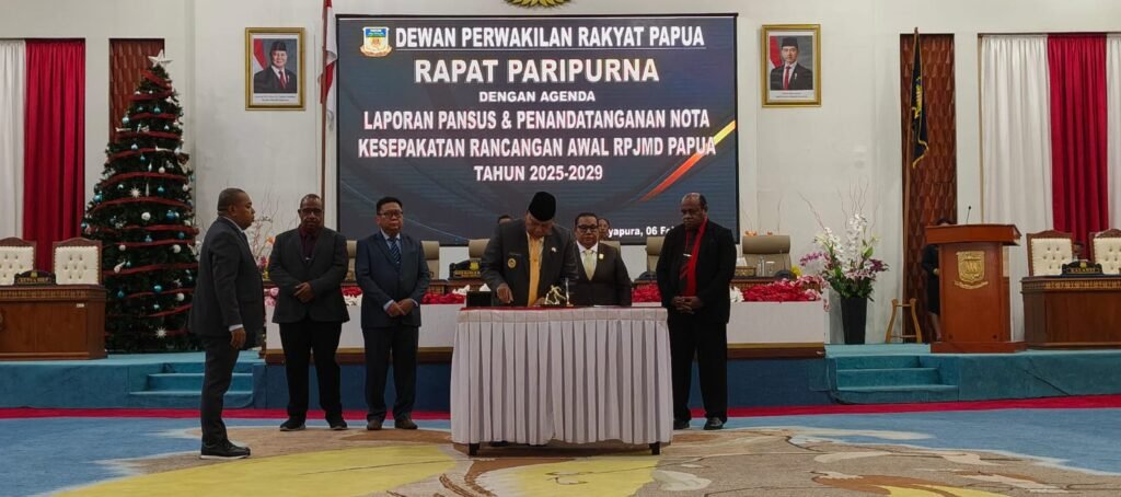 JAYAPURA, Binkari – Dewan Perwakilan Rakyat (DPR) Papua bersama Pemerintah Provinsi Papua secara resmi menyepakati pembahasan Rancangan Awal Rencana Pembangunan Jangka Menengah Daerah (Ranwal RPJMD) Provinsi Papua Tahun 2025–2029 dalam rapat paripurna DPR Papua, Jumat (6/2/2026).