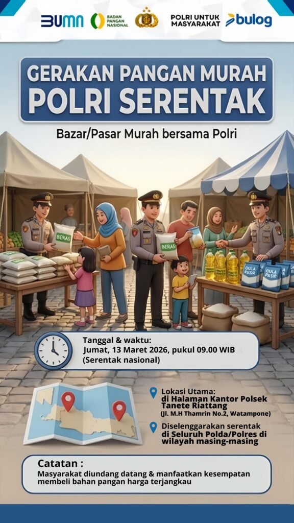 Di wilayah hukum Polres Bone Polda Sulawesi Selatan, kegiatan Gerakan Pangan Murah tersebut akan dipusatkan di halaman Kantor Polsek Tanete Riattang, Jalan M.H. Thamrin No. 2, Watampone. Kegiatan ini merupakan hasil kerja sama Polri dengan sejumlah instansi dan lembaga, di antaranya BUMN, Badan Pangan Nasional, serta Perum Bulog, sebagai bentuk sinergi dalam menjaga stabilitas harga dan ketersediaan bahan pangan bagi masyarakat.