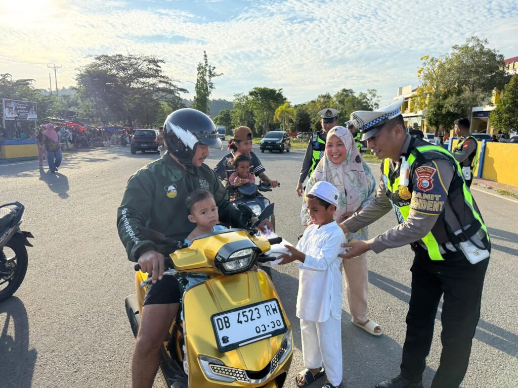 POLRES Halteng, Binkari – Satuan Lalu Lintas Polres Halmahera Tengah membagikan takjil kepada masyarakat di Kota Weda, Selasa (3/3/2026). Kegiatan ini merupakan bagian dari upaya berbagi kebahagiaan pada bulan Ramadan sekaligus mendekatkan diri kepada masyarakat.