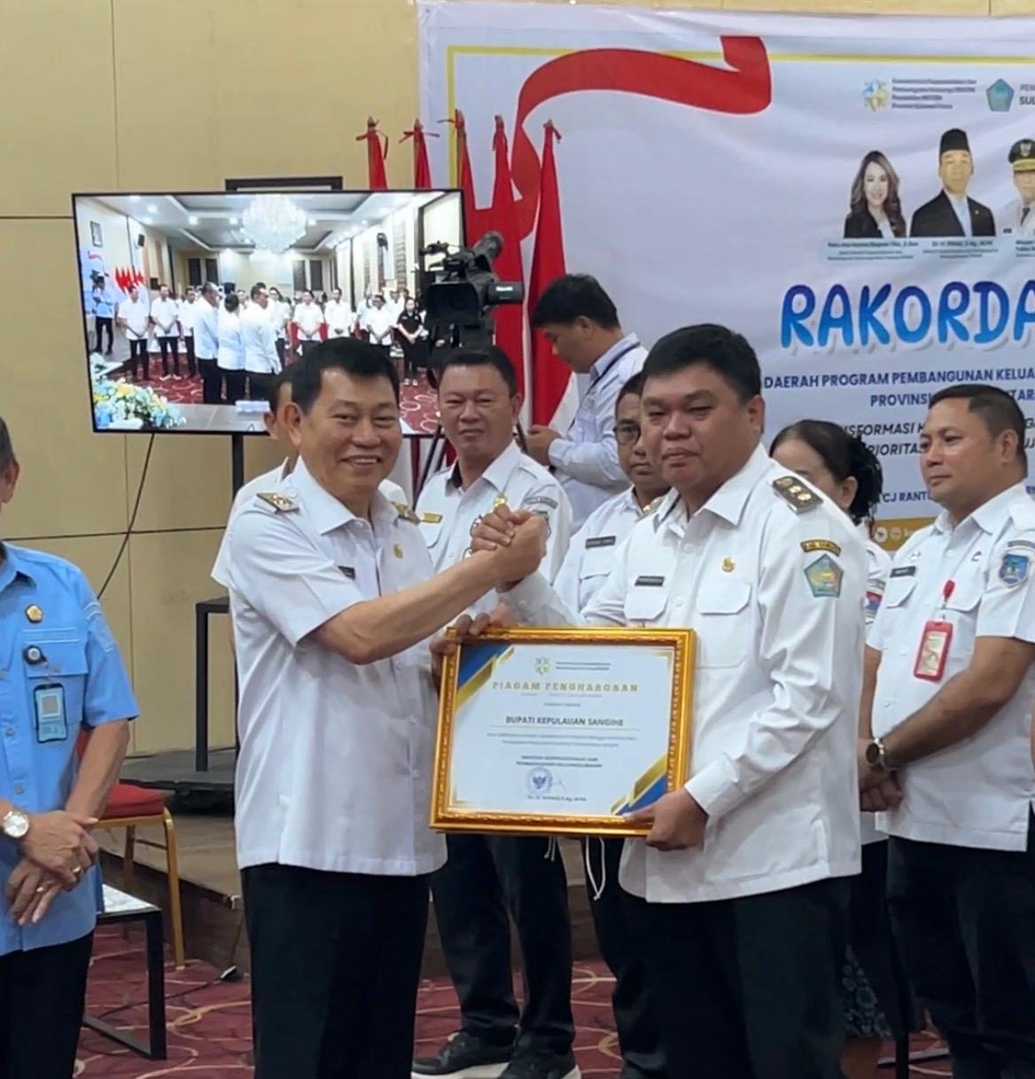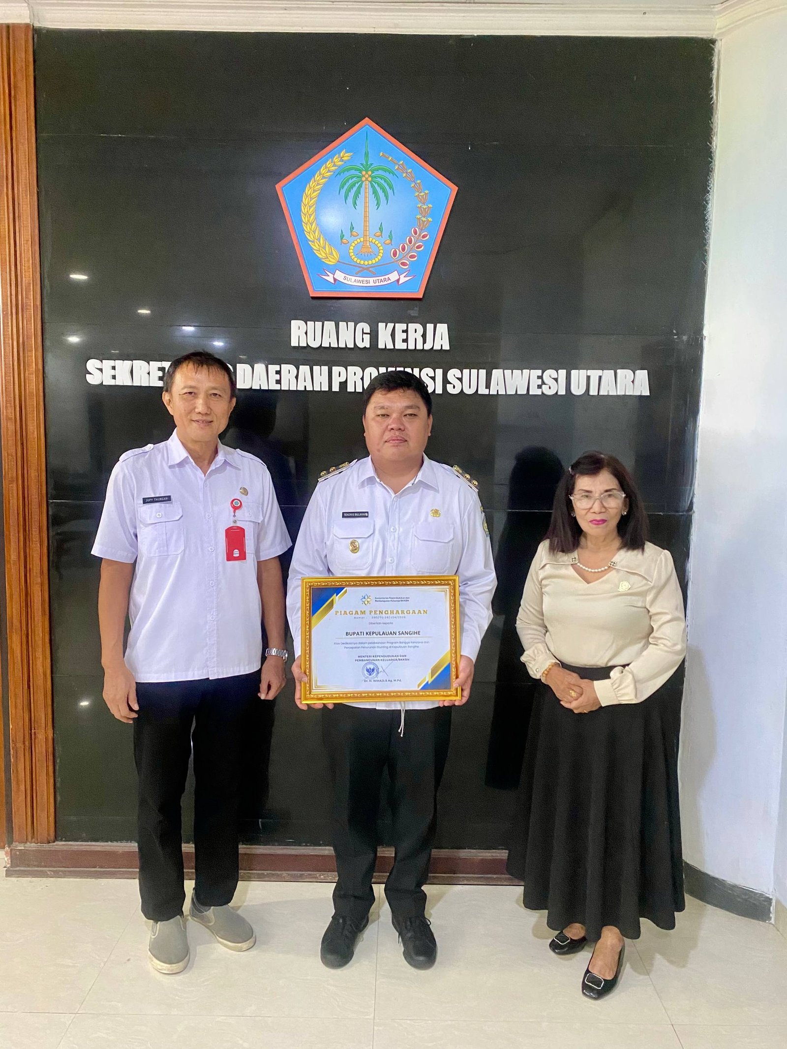 Penghargaan diserahkan langsung oleh Wakil Gubernur Sulut dan diterima oleh Wakil Bupati Tendris Bulahari.