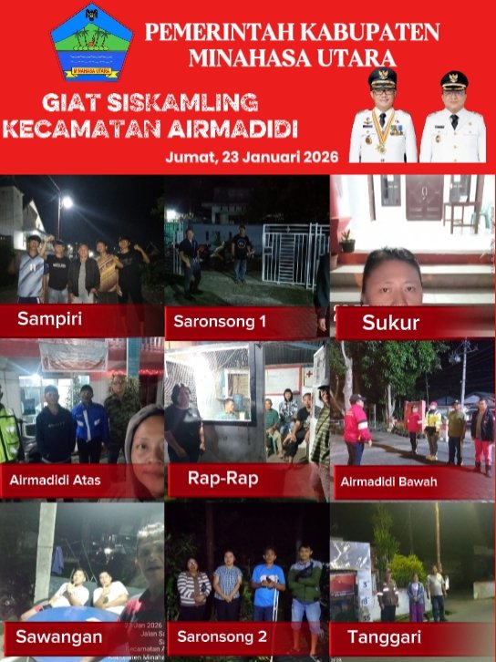 Adapun wilayah yang melaksanakan giat Siskamling meliputi Kelurahan Sukur, Kelurahan Saronsong I, Kelurahan Saronsong II, Kelurahan Airmadidi Atas, Kelurahan Rap-Rap, Kelurahan Airmadidi Bawah, serta Desa Sawangan, Desa Tanggari, dan Desa Sampiri.