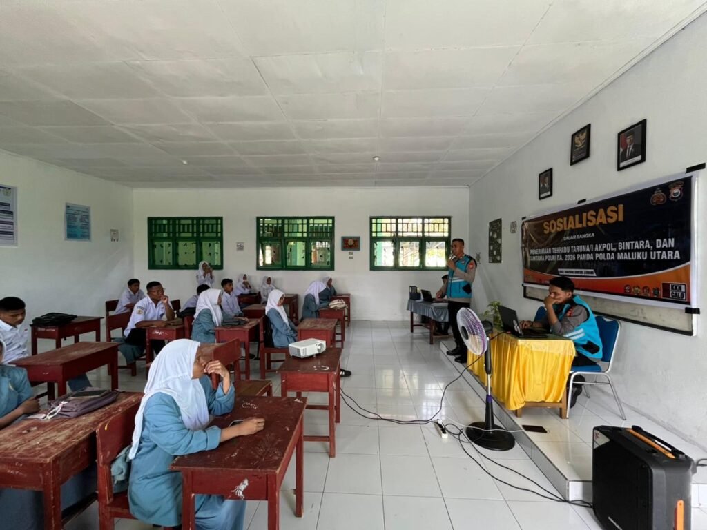 POLDA Maluku Utara, Sofifi, Binkari – Bertempat di Aula Madrasah Aliyah (MAS) Alkhairaat Guraping, Kepolisian Daerah Maluku Utara (Polda Malut) menggelar sosialisasi penerimaan calon anggota Polri Tahun Anggaran 2026, Senin (2/3/2026) kemarin. Kegiatan ini bertujuan untuk memberikan pemahaman kepada putra-putri terbaik dari lingkungan pendidikan Islam untuk mengabdi kepada bangsa melalui institusi Bhayangkara.